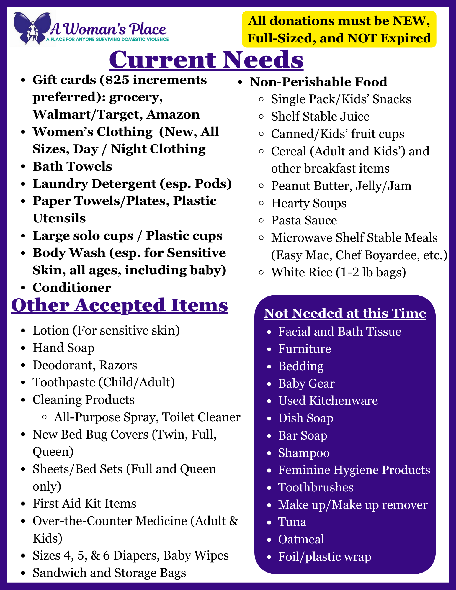 *Contact: advancement@awomansplace.org for drop-off times and if you would like donation receipts. Thank you in advance!
